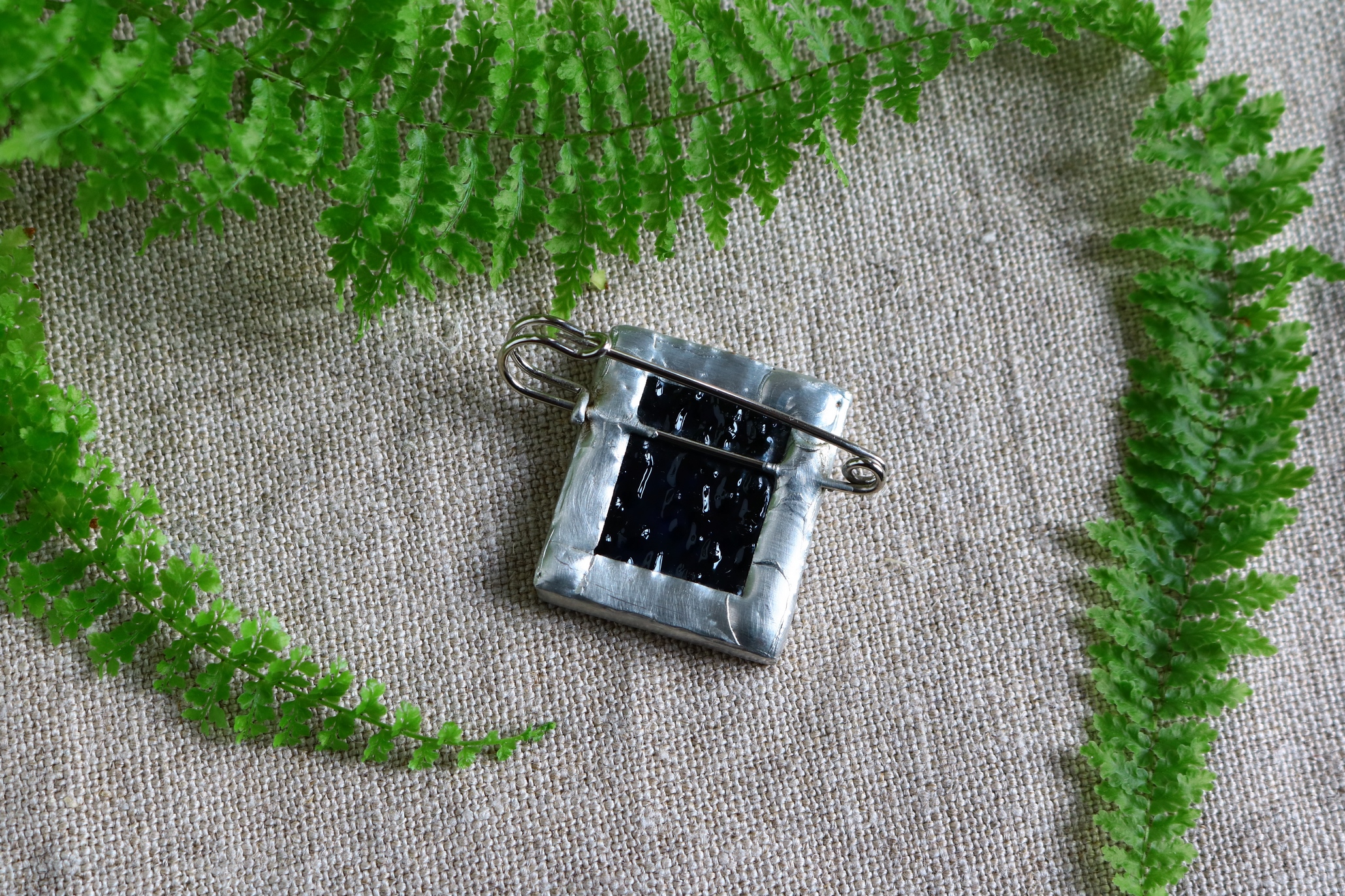 Przednia warstwa broszki to przezroczyste szkło, warstwa spodnia wykonana jest ze szkła witrażowego w kolorze ciemnofioletowym. Pomiędzy szkłem znajduje się znaczek pocztowy. Brosza połączona została w całość przy pomocy taśmy miedzianej oraz cyny. Broszka przypinana jest na dużą, metalową agrafkę.