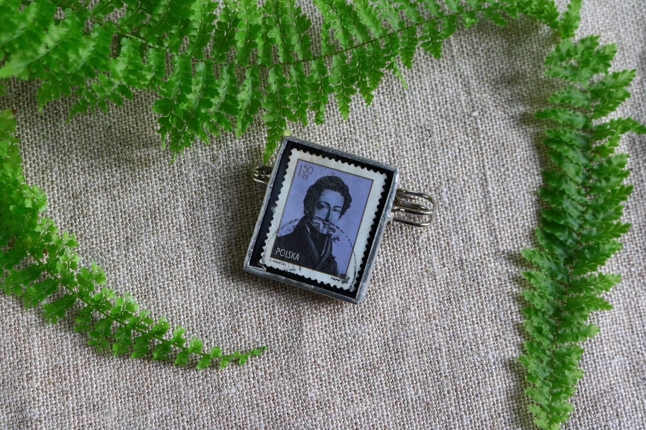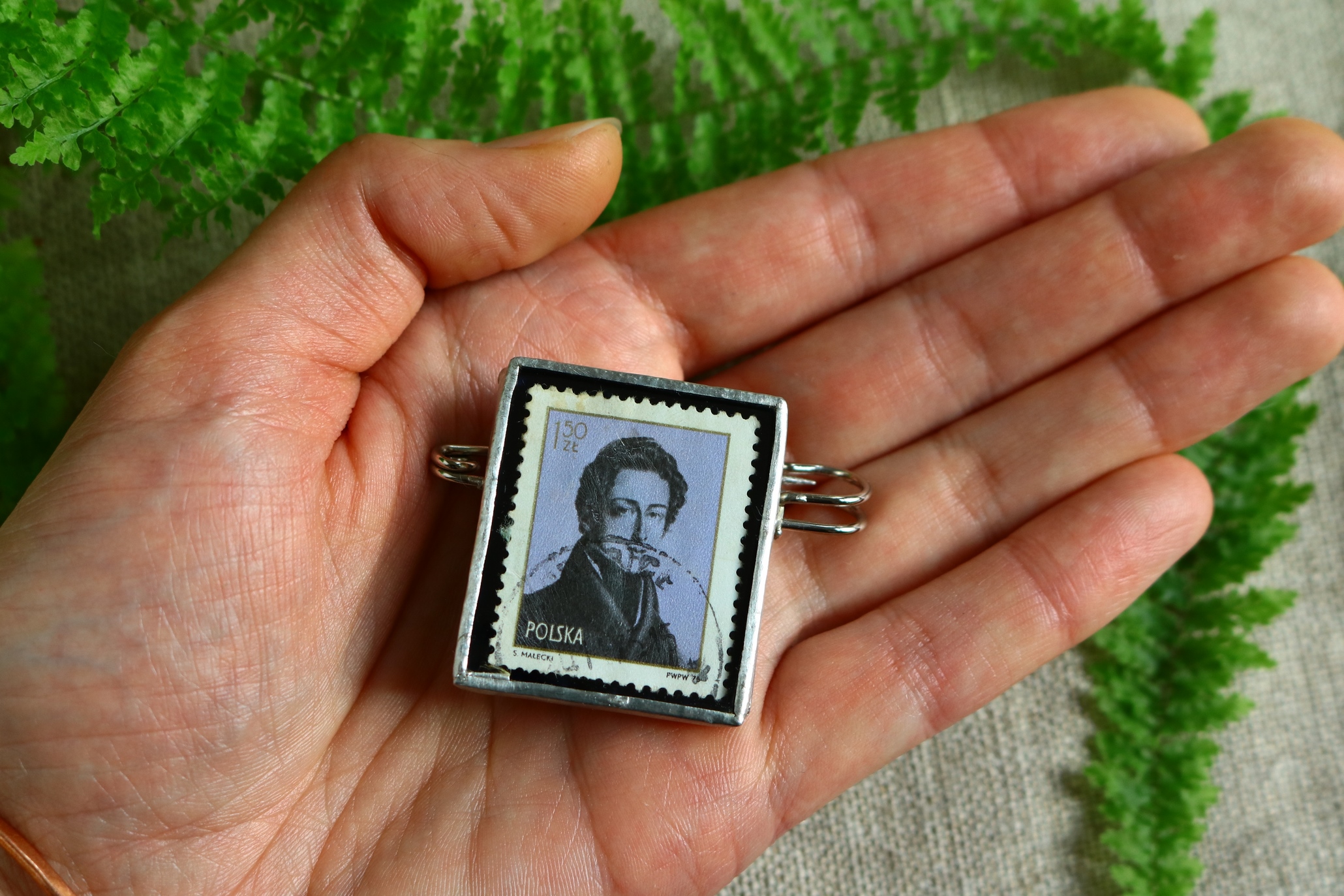 Broszka wykonana ze szkła oraz autentycznego znaczka pocztowego pochodzącego z okresu PRL. Znaczek należy do serii z 1975 roku wydanej z okazji IX Międzynarodowego Konkursu Pianistycznego im. F. Chopina i przedstawia sylwetkę Fryderyka Chopina.