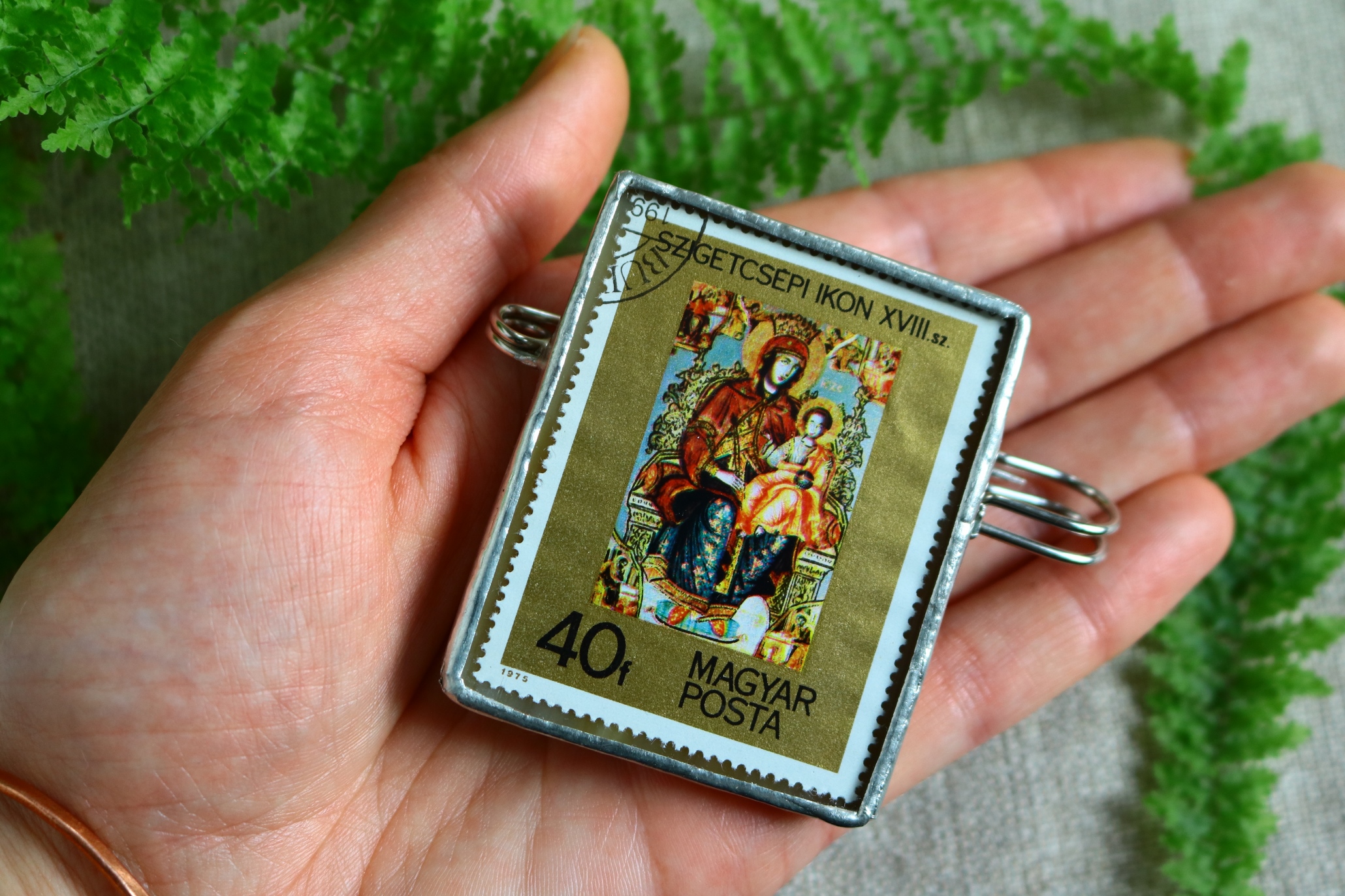 Broszka z motywem religijnym, na metalowej agrafce. Wykonana ze szkła oraz autentycznego znaczka pocztowego pochodzącego z Węgier. Znaczek należy do serii z 1975 roku przedstawiającej ikony religijne i przedstawia XVIII-wieczną ikonę z Szigetcsépi.