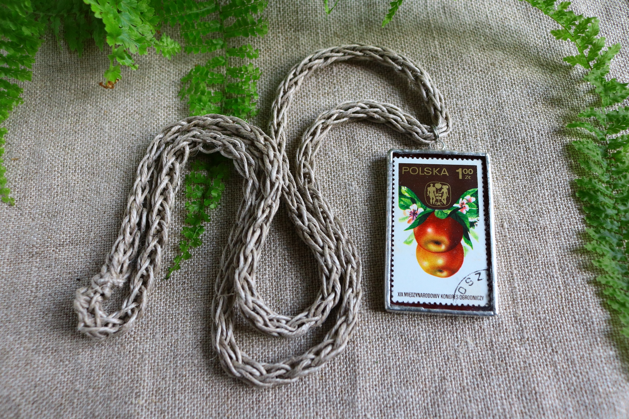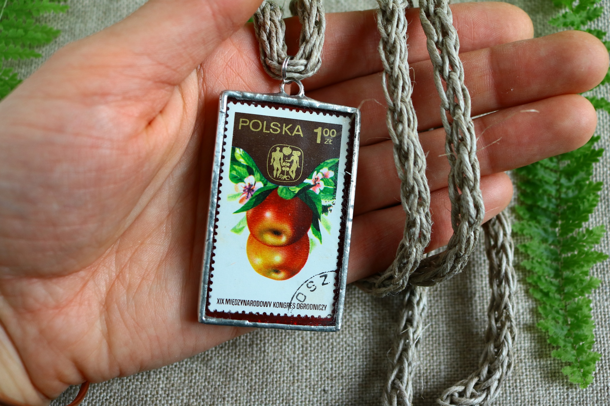 Ten unikatowy naszyjnik wykonany jest ze szkła oraz autentycznego znaczka pocztowego pochodzącego z okresu PRL. Znaczek należy do serii z 1974 roku wydanej z okazji XIX Międzynarodowego Kongresu Ogrodniczego w Warszawie i ilustruje jabłka.