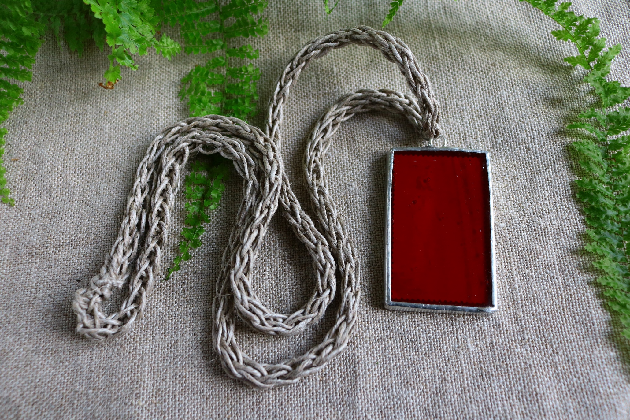 Wisiorek zawieszony jest na łańcuszku, wykonanym na laleczce dziewiarskiej z lnianego sznurka w kolorze naturalnym. Naszyjnik nie posiada zapięcia, zakładany jest przez głowę. Długość łańcuszka ok. 75cm.
